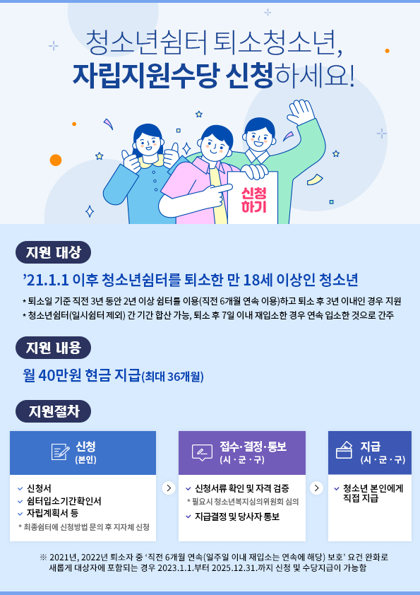 - 만 18세 이후 퇴소한 자('21년 1월 이후 퇴소자에 한함)